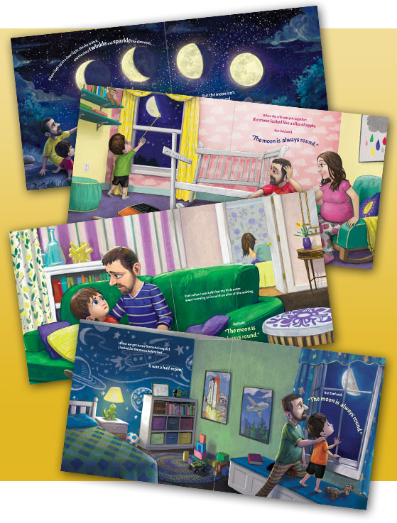 The idea is instilled repeatedly by father to child that "the moon is always round" even in the face of loss. In this book's story, the young family is expecting a new addition but there is the sadness of losing that young baby and not being able to bring it home.